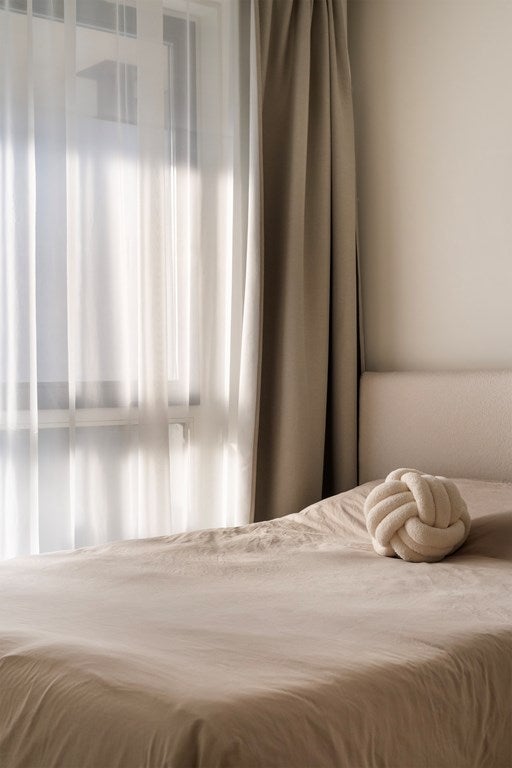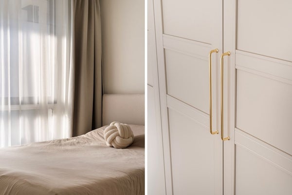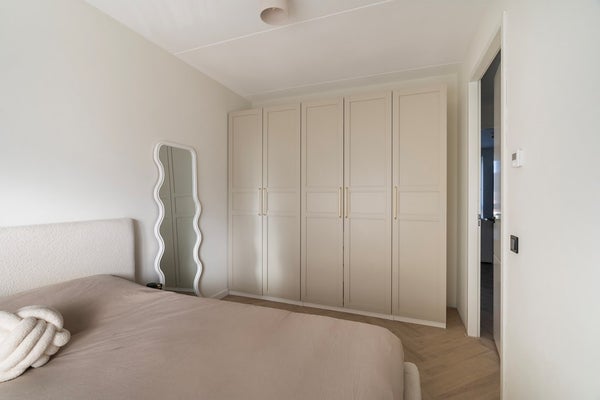 De slaapkamer aan de voorzijde is strak afgewerkt en heeft naast een tweepersoonsbed ook ruimte voor een grote garderobekast.