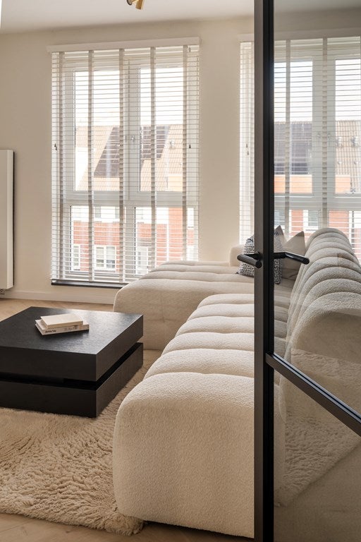Via deze prachtige zwarte deur komen we aan de achterzijde van de woning in de lichte woonkamer. De grote glaspartij met vier draai-/kiepramen zorgt voor een prachtige lichtinval.