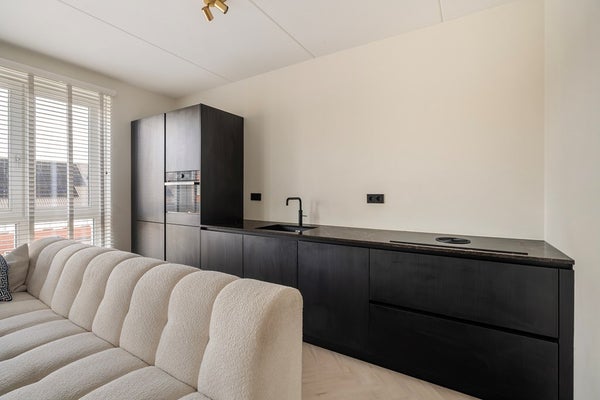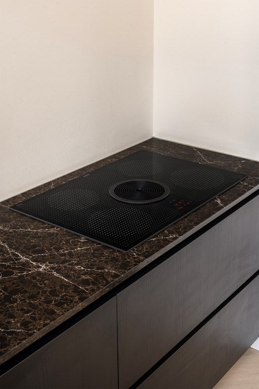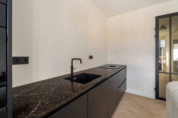 De open keuken is een echte eyecatcher: uitgevoerd in matzwart en compleet met hoogwaardige inbouwapparatuur, waaronder een kokend waterkraan en inductiekookplaat en een Bora recirculatie afzuigsysteem.