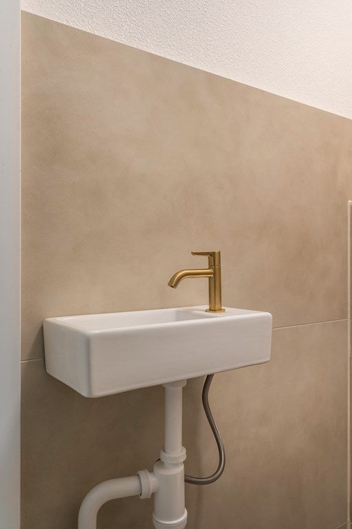 Je komt het appartement binnen in een lange, lichte hal die toegang biedt tot alle vertrekken. Hier vind je de garderobe, een moderne toiletruimte en een praktische technische ruimte met aansluitingen voor wasmachine en droger, de warmtepomp en een royale 200-liter boiler.