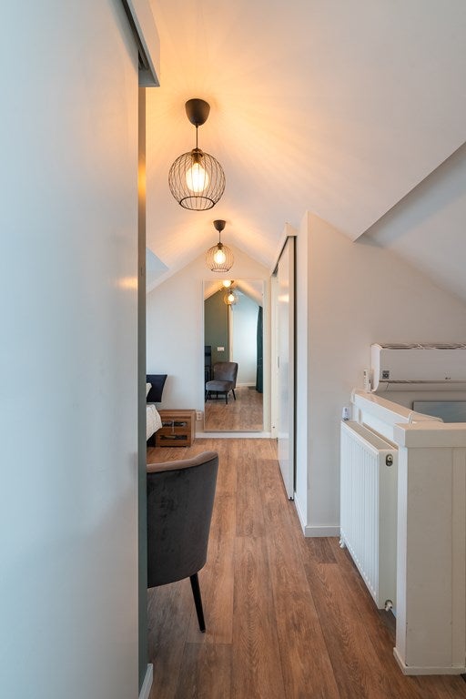 Dit exclusieve appartement is een ware maisonnette, verdeeld over twee verdiepingen, die je bereikt via een prachtig vormgegeven houten trap. De gehele woonlaag bevindt zich op de eerste etage en zodra je bovenkomt, ervaar je direct de intimiteit en geborgenheid die deze privé-etage kenmerkt.