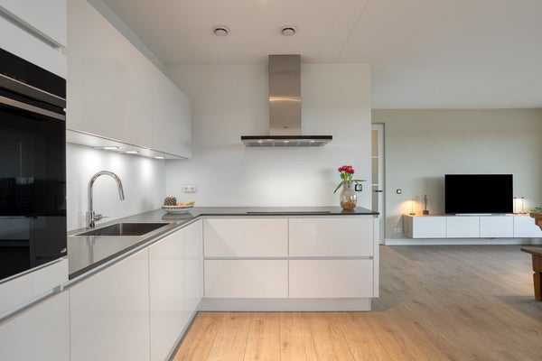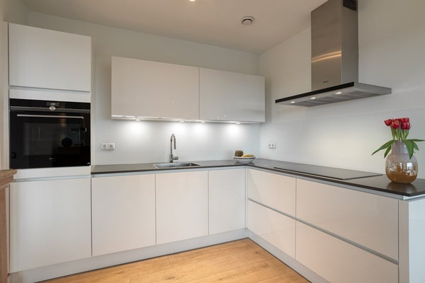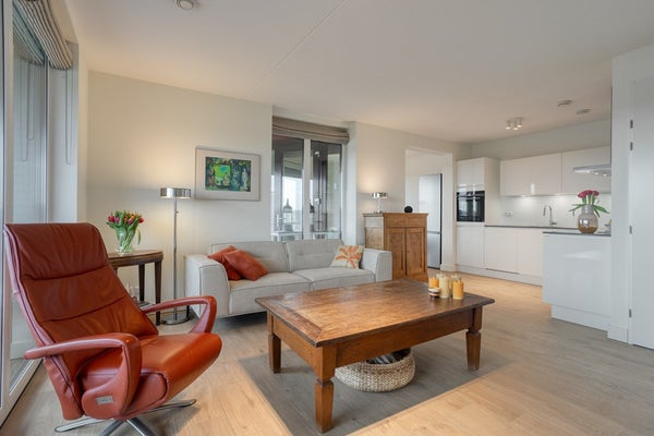 De lichte en sfeervolle woonkamer met open keuken heeft een totale oppervlakte van circa 38 m². Dankzij de hoekligging profiteert het appartement van extra veel daglicht, wat wordt versterkt door de grote raampartijen. Het zitgedeelte aan de voorzijde van het appartement biedt direct tuincontact via de ramen en de deur, die toegang geeft tot het ruime balkon.