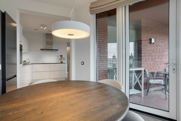 De moderne keuken is in een L-vorm gepositioneerd en volledig uitgerust met inbouwapparatuur van Siemens, waaronder een inductiekookplaat, een afzuigkap, een koel- vriescombinatie, een vaatwasser en een combi-oven. Aangrenzend bevindt zich de eetkamer van circa 9 m² groot, welke eveneens is voorzien van een prachtige lichtinval en een toegang tot het balkon.