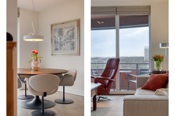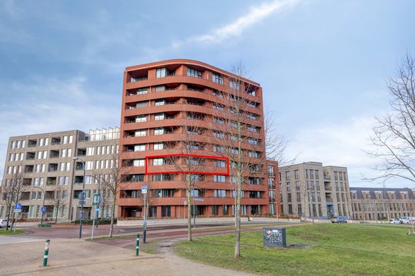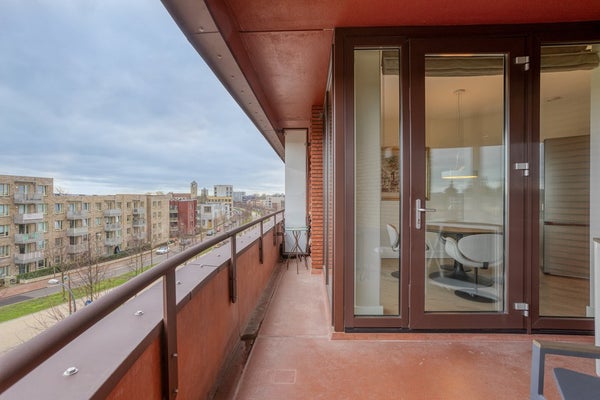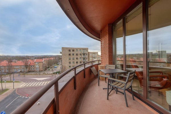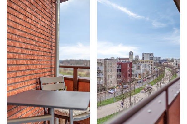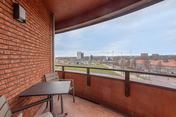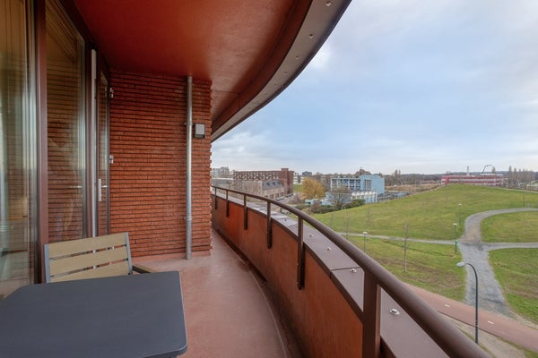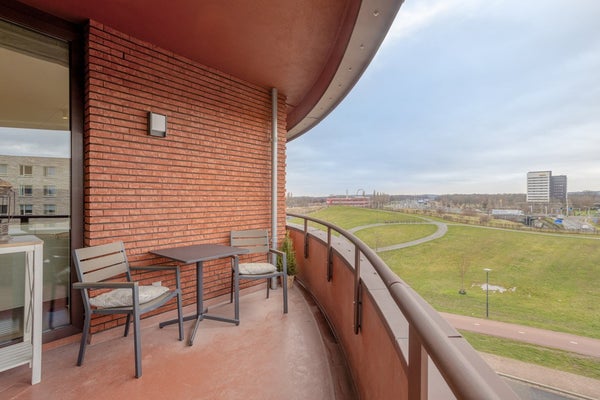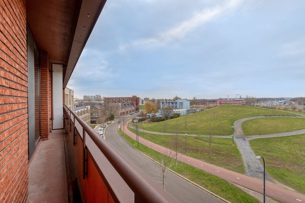 Het appartement is voorzien van een ruim en overdekt balkon, welke bereikbaar is via de deuren in de woonkamer, de eetkamer en de slaapkamer. Het overdekte balkon van ca. 24 m² strekt zich rondom het appartement uit en biedt een prachtig uitzicht op de Groene Loper en de stad. Dankzij de overkapping is het hier heerlijk zitten, zowel op warme als koelere dagen.