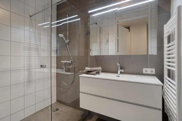 • Badkamer: De moderne badkamer van ca. 3 m² groot en voorzien van een inloopdouche, een wastafelmeubel met dubbele wastafel, een spiegelkast met verlichting en een handdoekradiator.