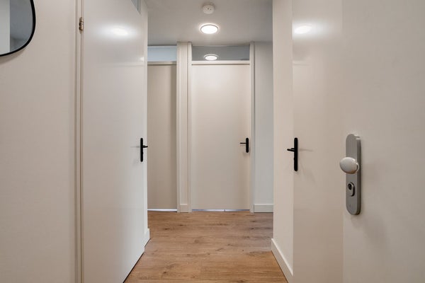 Via de entree bereikt u eveneens de twee slaapkamers en de badkamer: