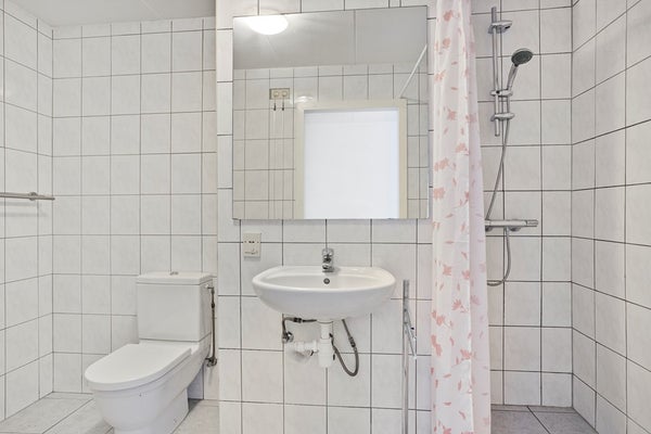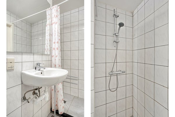 De badkamer (5m²) is eenvoudig maar functioneel, helemaal betegeld en voorzien van een staand toilet, een vaste wastafel, een inloopdouche en de aansluiting voor de wasmachine.