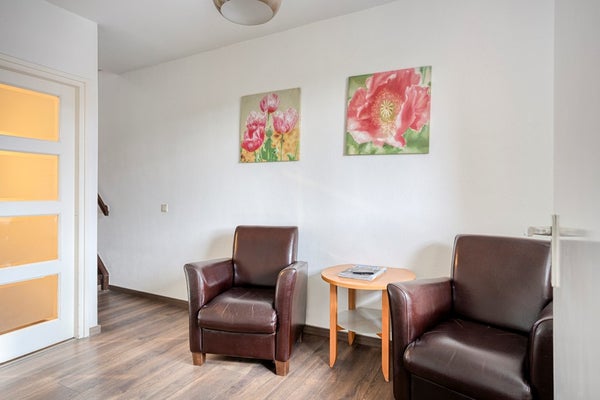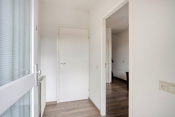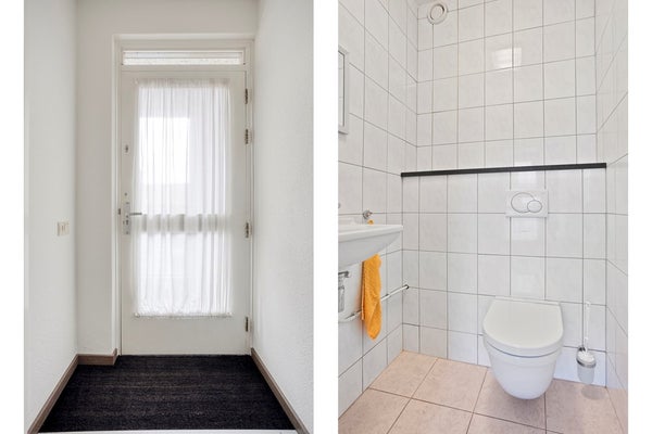 Entree/hal met toiletruimte voorzien van een wandcloset en fonteintje. Vanuit de hal is ook een fijne werk- of studeerkamer (10m²) bereikbaar, perfect voor wie graag vanuit huis werkt of een rustige plek zoekt.