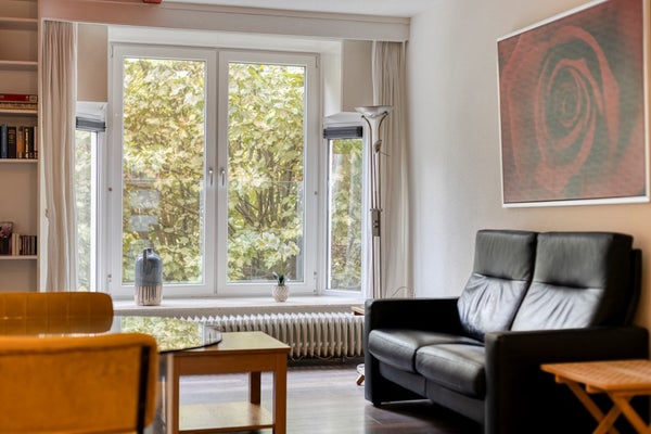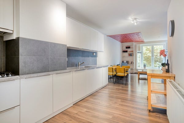 De woonkamer (20m²) is aan de achterzijde van het appartement gelegen en beschikt over een erker die zorgt voor extra ruimte en natuurlijk licht. Een handige trapkast biedt praktische opbergruimte om spullen netjes uit het zicht te bewaren. Bijna het gehele appartement is voorzien van een mooie laminaatvloer, wat een rustige en samenhangende sfeer creëert.