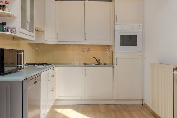 De woonkamer is licht en uitnodigend, mede dankzij de grote raampartijen. Vanuit de woonkamer stap je direct het riante dakterras op. wat een verlengstuk van je woonruimte vormt. De open keuken is praktisch ingericht in hoekopstelling met een 4-pits gasfornuis, spoelbak, afzuigkap, oven, vaatwasser en koelkast met vriesvak.