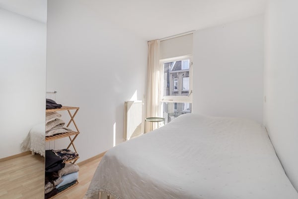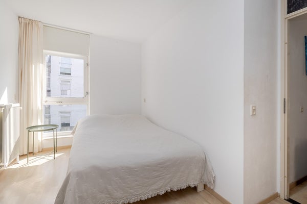 De slaapkamer is bereikbaar vanuit de hal en ligt aan de achterzijde van het appartement. Aangrenzend bevindt zich de badkamer, voorzien van douche, wastafel en aansluiting voor wasmachine/droger.