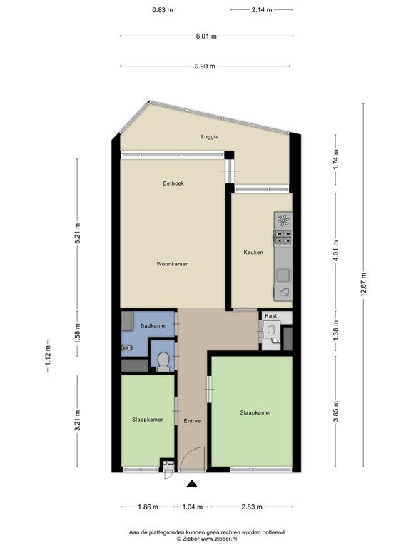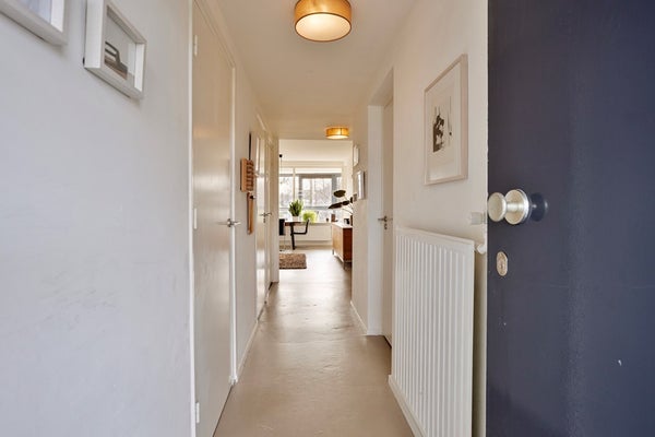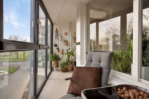 Via de lift of het trappenhuis bereikt u dit verzorgd appartement op de derde verdieping. Bij binnenkomst komt u in de ruime entree/hal van (8m²), die toegang biedt tot alle vertrekken en zorgt voor een prettige en overzichtelijke indeling. De lichte woonkamer (28m²) is afgewerkt met een moderne industriële vloer en beschikt over een openslaande deur naar de royale loggia van circa 9m². De loggia is gunstig gelegen op het zuidoosten, waardoor u hier gedurende een groot deel van de dag kunt genieten van de zon en een aangename (buiten)ruimte heeft die het wooncomfort vergroot. De keuken (9m²) is verplaatst naar de achterzijde van het appartement, wat heeft gezorgd voor aanzienlijk meer lichtinval en een directe verbinding met de loggia. De keuken is uitgevoerd in een rijopstelling, is voorzien van een composiet aanrechtblad en beschikt over de volgende (inbouw)apparatuur, te weten: spoelbak, 4 pits gasfornuis, oven, koelkast en vaatwasser. Naast de keuken bevindt zich een praktische berging met de witgoedaansluitingen, de cv-installatie en de mechanische ventilatie. Aan de voorzijde van het complex zijn twee slaapkamers gesitueerd met een oppervlakte van respectievelijk circa 11m² en 6m², geschikt als hoofdslaapkamer en bijvoorbeeld een werk-, logeer- of kinderkamer. De badkamer (2m²) is vernieuwd in 2025 en voorzien van een douche en vaste wastafel. Naast de badkamer is er een separaat toilet.