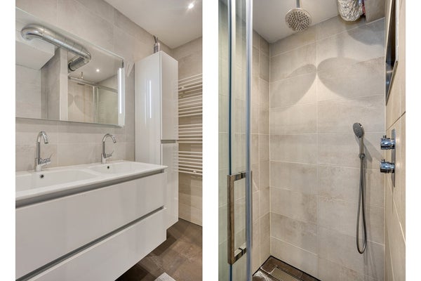 De nette badkamer is voorzien van een dubbele wastafel in badkamermeubel, inloopdouche met hardglazen deur en een handdoekradiator.