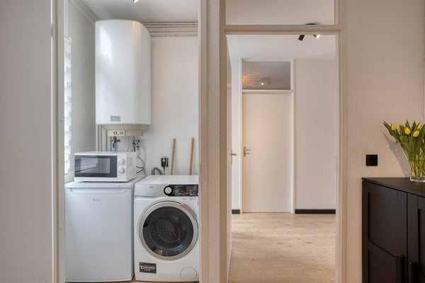 De zonnige woonkamer heeft een mooie lichtinval door de grote, op het zuiden gelegen, raampartij en geeft toegang tot het balkon dat tevens op het zuiden gelegen is. De woonkamer is voorzien van een keurige laminaatvloer die is doorgelegd in alle ruimtes behalve het toilet en de badkamer.