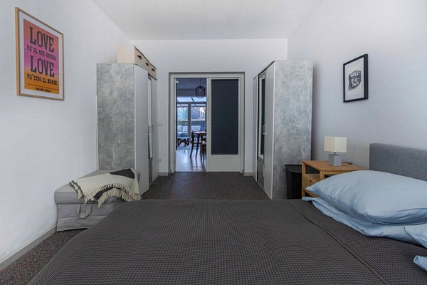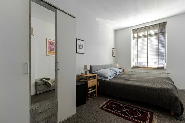 Vanuit de woonkamer is de eerste slaapkamer (ca. 14 m²) bereikbaar via een karakteristieke glas-in-lood deur. Deze kamer is afgewerkt met een grindvloer.