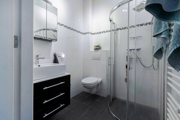 De moderne, volledig betegelde badkamer beschikt over een douchecabine, wastafel, handdoekenradiator en een zwevend toilet.