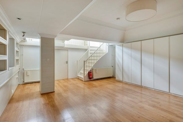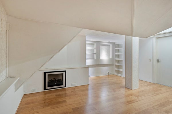 De woonkamer is enkele treden lager gelegen en kenmerkt zich door een prettige lichtinval, een visgraat parketvloer en praktische inbouwkasten. Vanuit de woonkamer is er een open verbinding met zowel de eetkamer als de lager gelegen slaapverdieping.