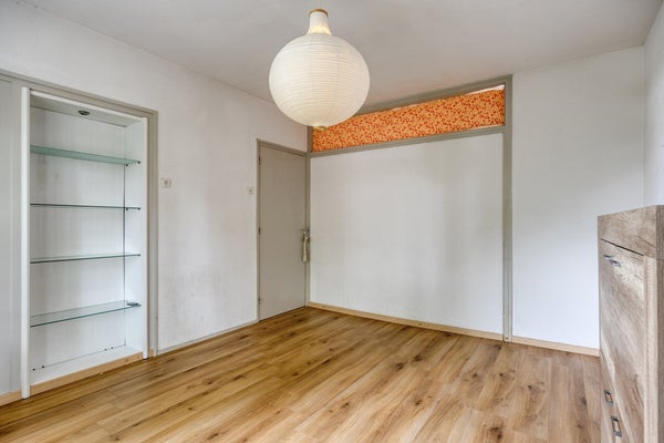 De (slaap)kamer (14m²) aan de voorzijde beschikt over twee ingebouwde bergkasten en eveneens een laminaatvloer.