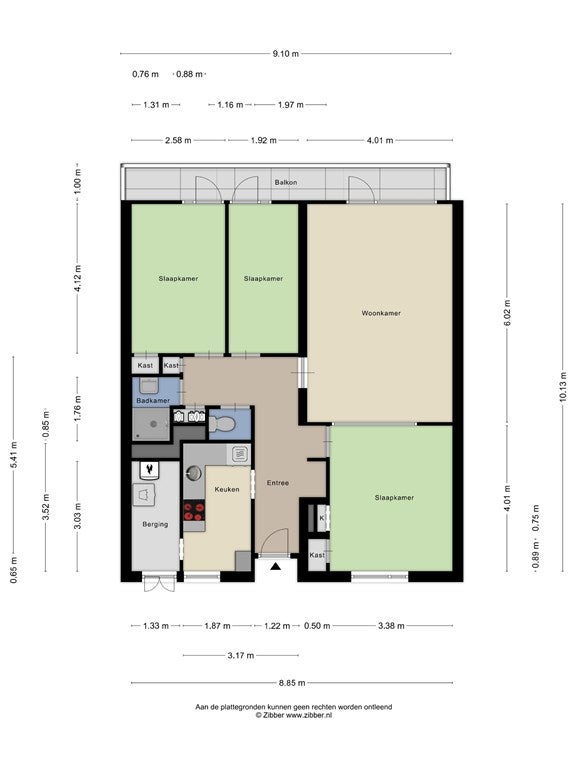 De twee overige slaapkamers van respectievelijk 11m² en 8m² bevinden zich aan de achterkant, zijn voorzien van vloerbedekking en hebben openslaande deuren naar het balkon. Een van deze kamers beschikt bovendien over een praktische muurkast.