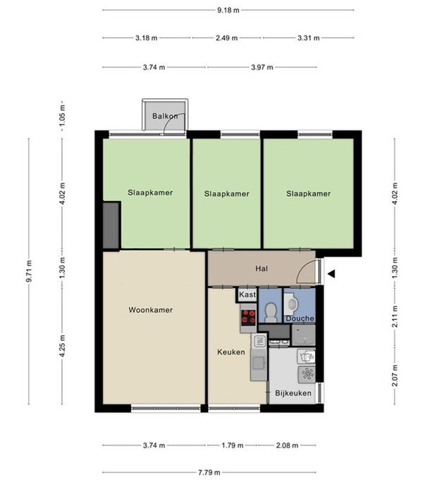- De portiekflat heeft een woonoppervlakte van 79 m² en beschikt over 4 kamers, waarvan 3 slaapkamers;