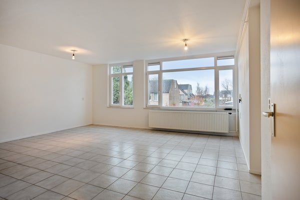 De woonkamer is afgewerkt met een lichte tegelvloer en beschikt over grote raampartijen, wat zorgt voor een prettige lichtinval. De open keuken is voorzien van een eenvoudige hoekopstelling met diverse kasten en laden.