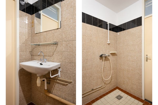 De eenvoudige badkamer is uitgerust met een inloopdouche, wastafel, toilet en een aansluiting voor de wasmachine.