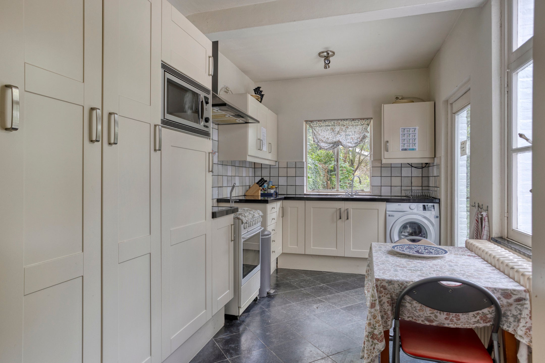 In het souterrain vindt u een gewelfde kelder. Op de begane grond zijn er een entree/hal met tegelvloer, een toilet met fonteintje, en een zeer royale kamer en suite. De keuken met hardstenen vloer is voorzien van een hoekopstelling en geeft toegang tot de diepe stadstuin.