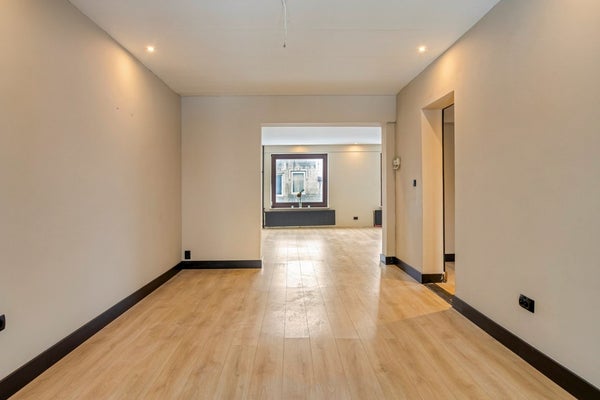 De bovenwoning is bereikbaar via een afgesloten trapopgang en onderscheidt zich direct door haar zeer royale opzet. Op de eerste verdieping bevindt zich een bijzonder ruime woonkamer die het hart van de woning vormt. Door de afmetingen en de open opzet is er volop ruimte voor een comfortabele zithoek en biedt de verdieping daarnaast uitstekende mogelijkheden voor het realiseren van een grote open keuken. De beschikbare ruimte maakt diverse indelingsvarianten mogelijk, passend bij zowel een modern als klassiek woonconcept. De huidige keuken betreft een gesloten variant met eenvoudige apparatuur, waaronder een combi magnetron, keramische kookplaat, afzuigkap en spoelbak. Aan de achterzijde van deze woonlaag bevindt zich een ruime, lichte kamer die middels een schuifpui in directe verbinding staat met het dakterras. Deze ruimte profiteert van veel daglicht en vormt een prettig verlengstuk van het woonoppervlak. Het dakterras biedt een aangename buitenruimte met privacy.