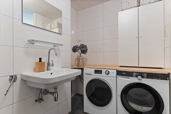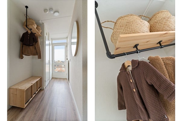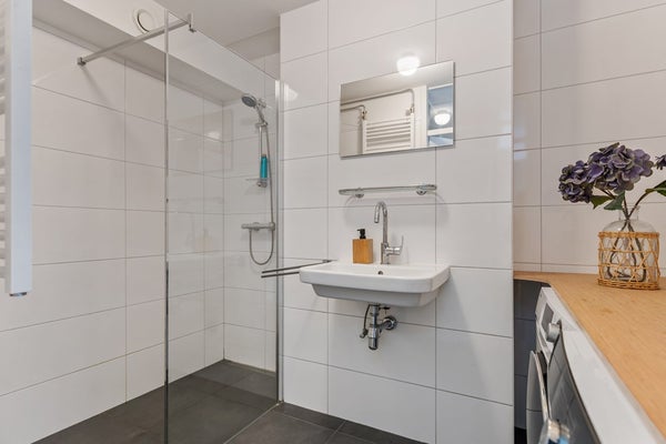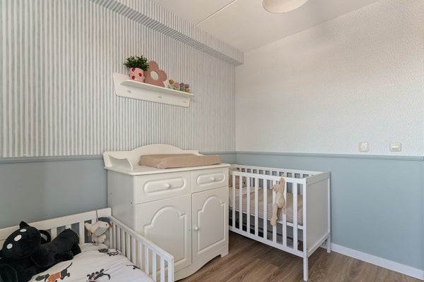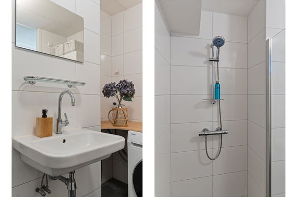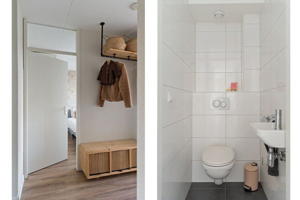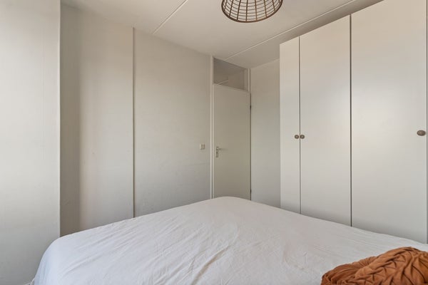 Bij binnenkomst stap je in de hal, die toegang biedt tot alle vertrekken. Aan weerszijden bevinden zich de twee slaapkamers, beide bieden genoeg ruimte en geschikt als slaapkamer, werk of logeerkamer. Verderop in de hal vind je het separate toilet. Aangrenzend bevindt zich de nette badkamer, uitgerust met een douche, wastafel en aansluitingen voor zowel wasmachine als droger.