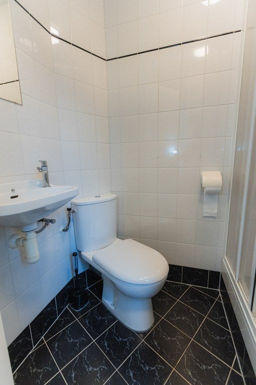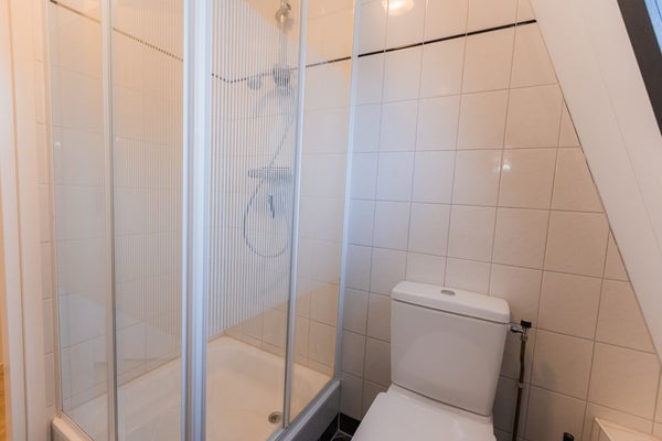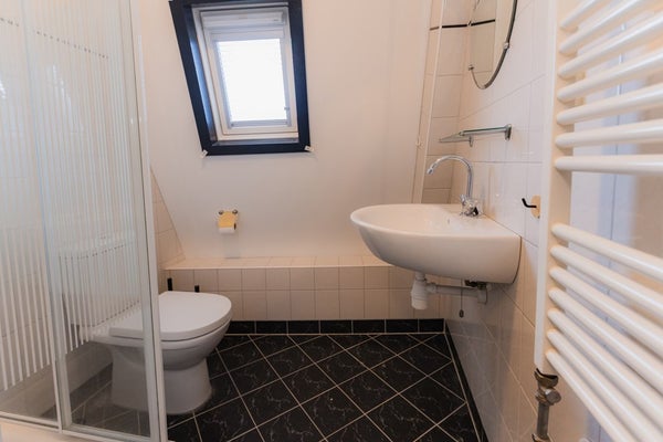 Vanuit de hal bereik je de nette badkamer met toilet, wastafel, douchecabine en handdoekradiator.