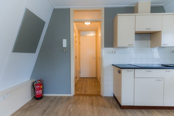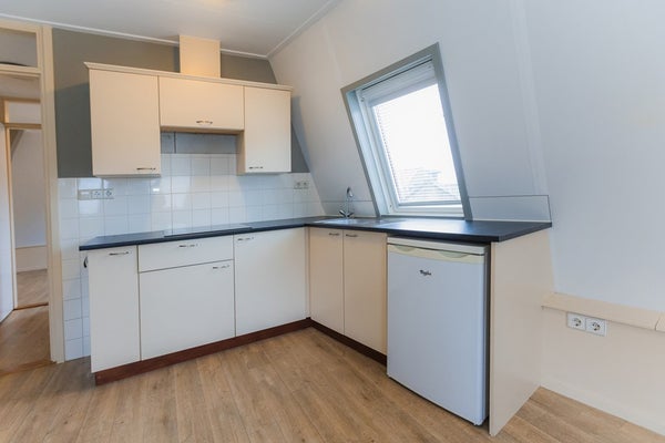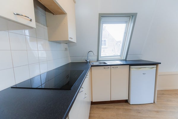 Entree met trapopgang naar het appartement. Deze ruimte fungeert als een gemeenschappelijk berging. Via de trap kom je bij de voordeur van het appartement. De entree geeft toegang naar de badkamer, slaapkamer en woonkamer. De woonkamer heeft een open keuken en rondom zijn er dakramen waardoor veel licht naar binnen komt. De keuken is voorzien van een nieuwe kookplaat met afzuigkap. Verder is er dan nog een losse koelkast.