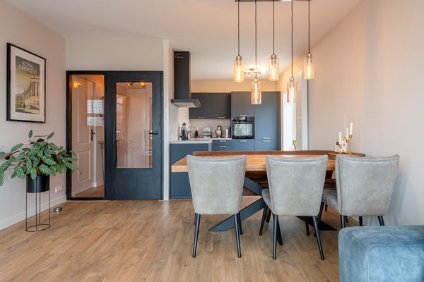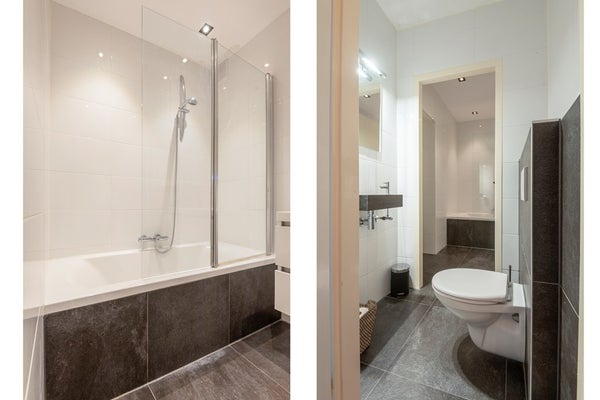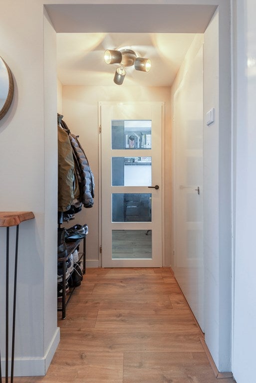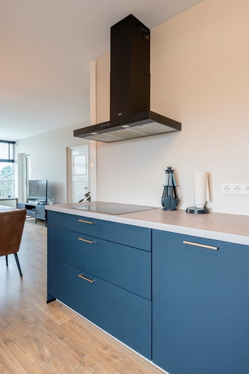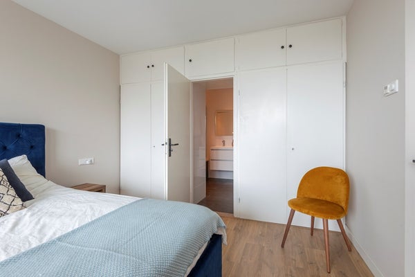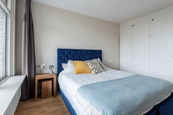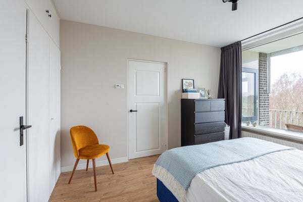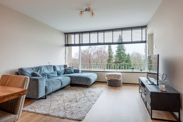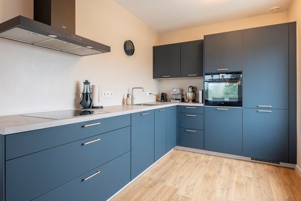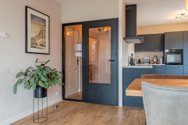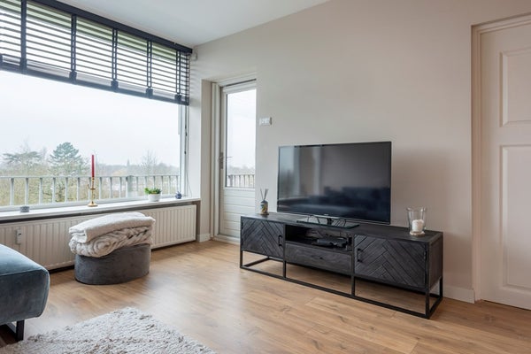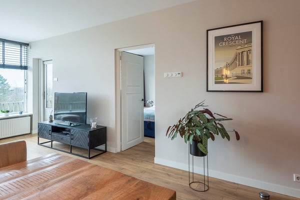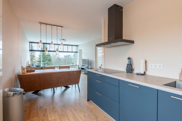 Op de vloer ligt een mooie laminaatvloer met hoge plinten welke drempelloos is doorgelegd naar de slaapkamer. De wanden en het plafond zijn in 2022 voorzien van nieuw, strak en glad stucwerk. De open keuken, in hoekopstelling, beschikt over een inductie kookplaat met afzuigkap, koel-vries combinatie, vaatwasser, oven, Quooker en voldoende kastruimte.. De grote slaapkamer, met uitzicht over het groen, is aan de achterzijde van het appartement gelegen en is ca.13,5 m2 groot en voorzien van twee praktische inbouwkasten. De badkamer, o.a. bereikbaar vanuit de slaapkamer, beschikt over een ligbad met douche, een wastafelmeubel met spiegel, handdoekradiator en is in neutrale kleurstelling betegeld. Het separate moderne toilet is zowel vanuit de hal en de badkamer te bereiken.