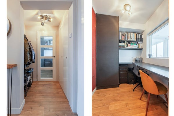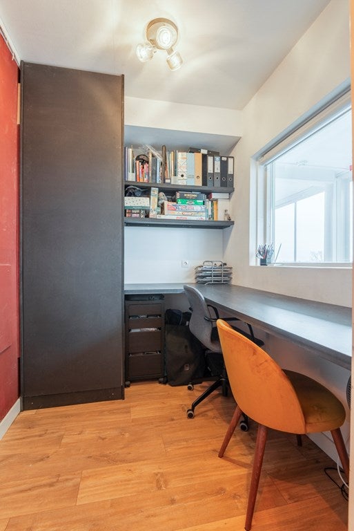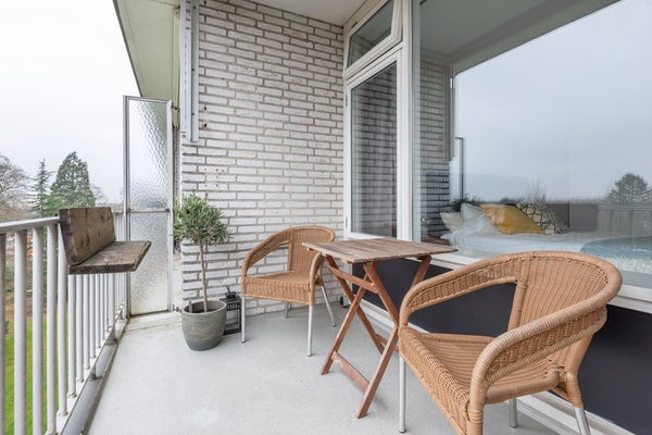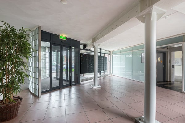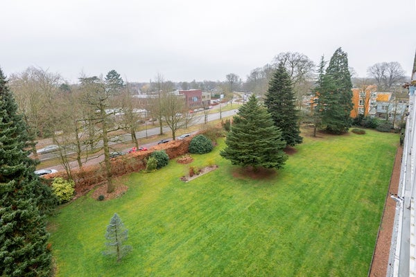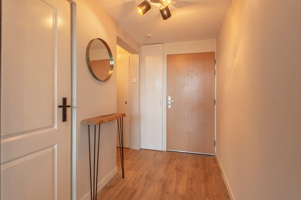 De entree is op de 6e verdieping (geen bovenburen) en aan het eind van de corridor, dus geen langslopende buren. Een ruime hal met garderobe biedt toegang tot de woonkamer, toilet en de werkkamer waar momenteel o.a. de wasmachine /droger netjes is weggewerkt. De zeer lichte woonkamer, met fraaie open keuken (2022), heeft een groot raam en daardoor een geweldig vrij uitzicht over de fraaie tuin en een deur naar het balkon. Op het balkon heeft u de beschikking over een elektrisch bedienbaar zonnescherm.