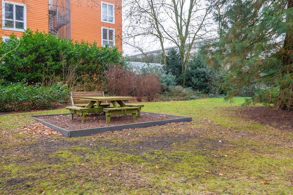 Chopinlaan 2-F1 is gelegen in de rustige en groene wijk Ministerpark (Componistenkwartier) in Naarden. Het appartementencomplex “Beukenrode” heeft een parkachtige tuin met leuke zithoek. Deze is voor alle bewoners vrij toegankelijk en kan bijvoorbeeld gebruikt worden om verjaardagen te vieren.