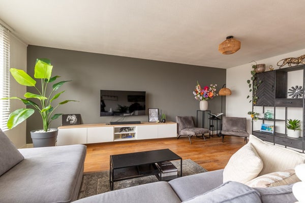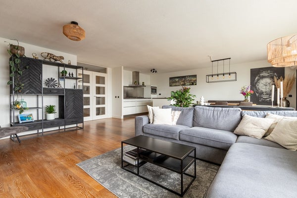 Via stijlvolle dubbele deuren komt u in de woonkamer. Deze lichte en royale leefruimte staat in open verbinding met de keuken, die is uitgevoerd met een keukeneiland en volop werk- en bergruimte biedt. Vanuit de woonkamer heeft u toegang tot het balkon, waar u heerlijk kunt genieten van de buitenlucht.