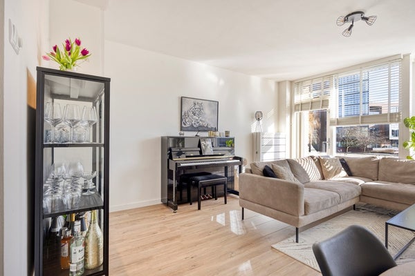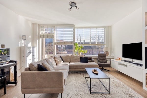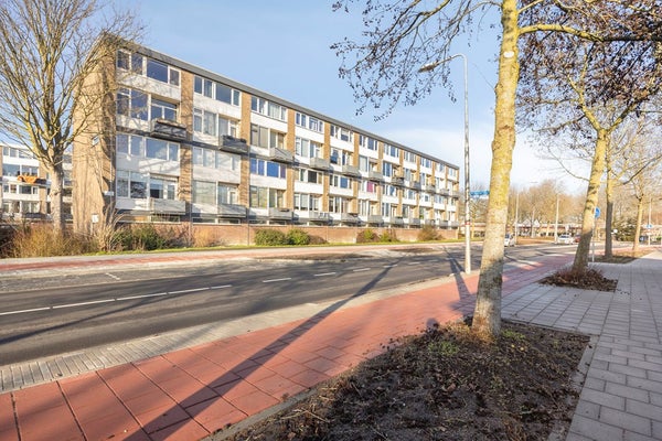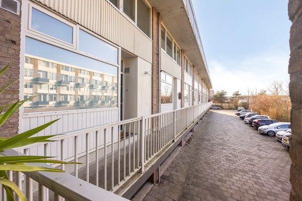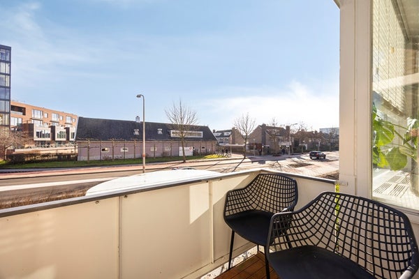 Het balkon ligt op het zuidoosten, waarbij je op een zonnige dag heerlijk onder het zonnescherm kan zitten en uitzicht hebt op de levendige Batavierlaan.
