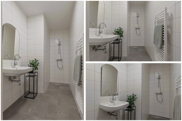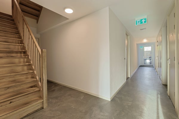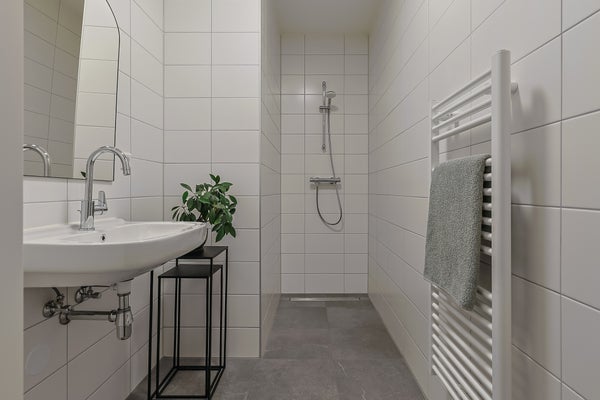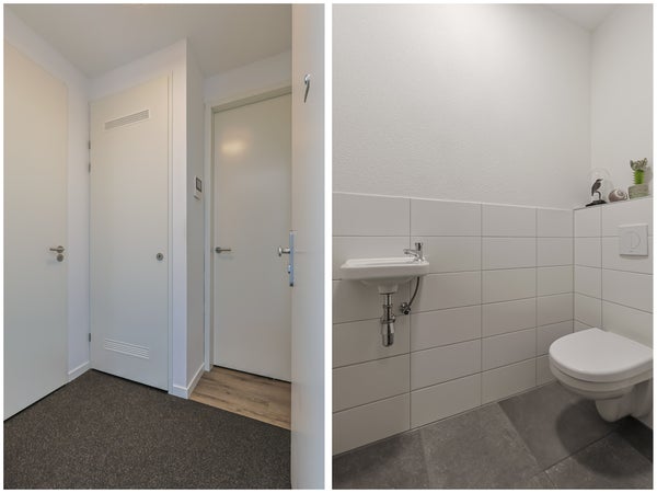 Je stapt binnen in een verrassend ruime hal met meterkast en moderne toiletruimte. Hier bevindt zich ook de videointercom, waarmee je gemakkelijk ziet wie er aanbelt. De badkamer is fris en functioneel, met een inloopdouche, wastafel en handdoekradiator. De combinatie van witte wandtegels en een donkergrijze vloer geeft een rustige uitstraling.