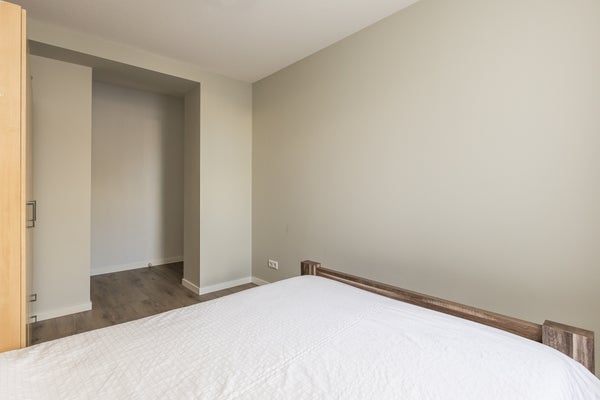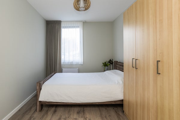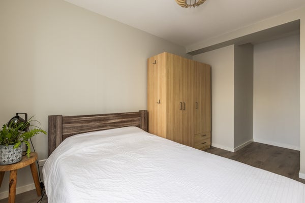 Grenzend aan de keuken is een open ruimte die nu als eetgedeelte wordt gebruikt, maar waar je ook een fijne werkplek of extra kamer kunt realiseren. Aan de achterzijde ligt de woonkamer, met grote ramen en een deur naar buiten. Hier valt het daglicht mooi naar binnen en heb je zicht richting de parkeerplaats en het centrum. De slaapkamer ligt ook aan de achterzijde en biedt ruimte voor een groot bed en kast.