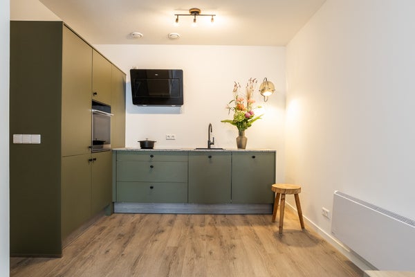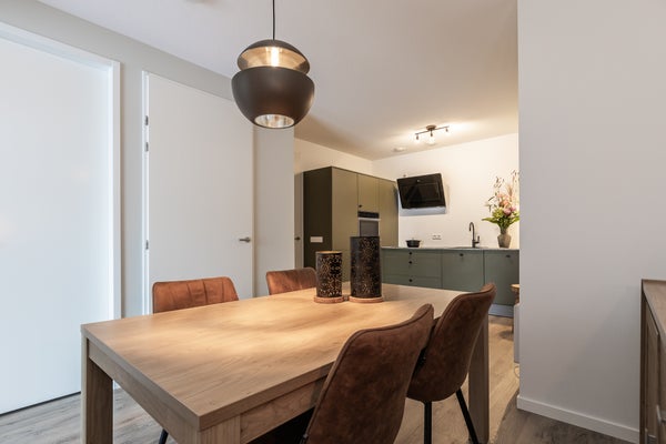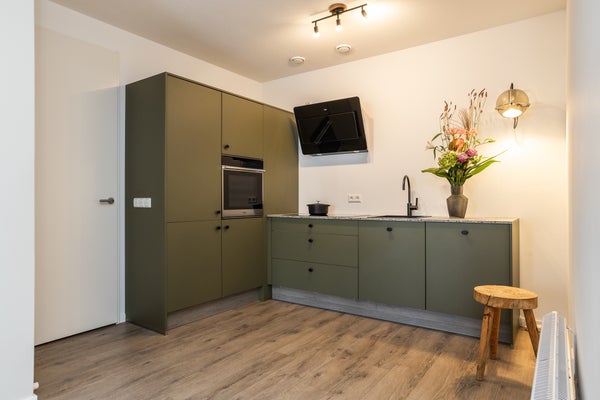 De open keuken ligt centraal in de woning en is uitgevoerd in een warme donkergroene kleur met een stijlvol werkblad in steenlook. Dankzij de hoekopstelling is er veel werkruimte. De keuken is compleet uitgerust met een inductiekookplaat, vaatwasser, vlakscherm afzuigkap, oven en losse koel-/vriescombinatie. In een aparte kast zijn aansluitingen voor de wasmachine en plek voor voorraad of schoonmaakspullen.