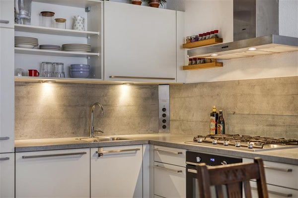 De keuken is een luxe hoekkeuken en staat in open verbinding met de rest van het appartement, waardoor alles dichtbij en binnen handbereik is. Of je nu een snelle maaltijd klaarmaakt of uitgebreid gaat koken voor jezelf of een gast, alles wat je nodig hebt is aanwezig.