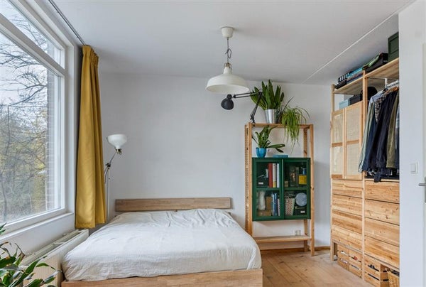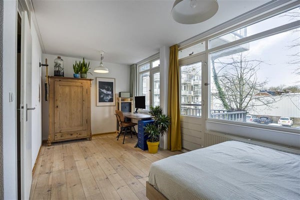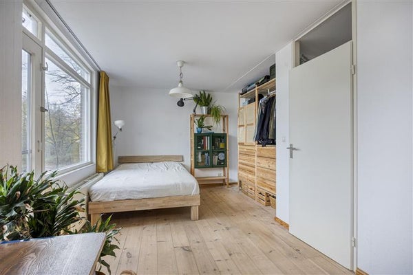 Momenteel heeft de woning één royale slaapkamer. Je kunt op een eenvoudige manier weer twee slaapkamers realiseren door een tussenmuur te plaatsen. De slaapkamer is afgewerkt met een sfeervolle vloer en grenst aan het balkon met uitzicht op het groen. Een fijne plek waar je na iedere nacht uitgerust wakker wordt.