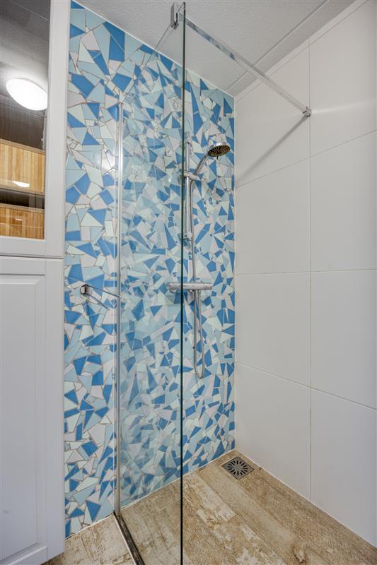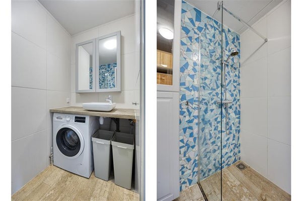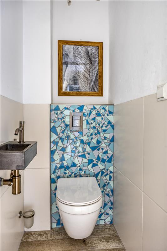 De badkamer is volledig betegeld en voorzien van een douche, wastafel en een aansluiting voor de wasmachine. Helemaal ingericht op jouw dagelijkse gemak. Direct naast de badkamer is een apart toilet met fonteintje.