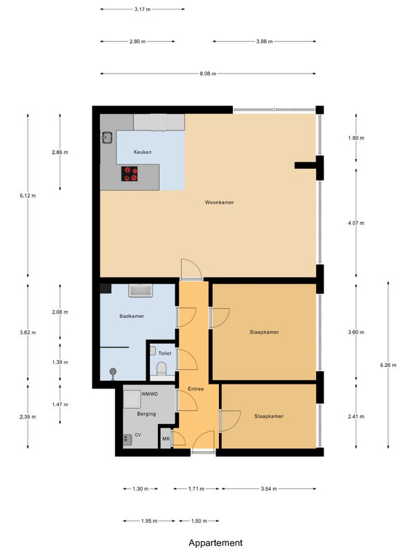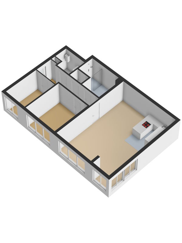 - De galerijflat heeft een woonoppervlakte van 99 m² en beschikt over 3 kamers, waarvan 2 slaapkamers;