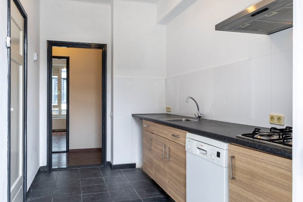 Eerste verdieping: entree appartement, gang, (slaap)kamer met vaste kast, woonkamer met vaste kast, (slaap)kamer met vaste kast en deur naar het dakterras, dichte keuken met keukeninrichting in lengteopstelling, inbouwapparatuur en deur naar het dakterras, badkamer met hoekfontein en douche, vaste kast met opstelplaats cv-combiketel, toilet met wandcloset.