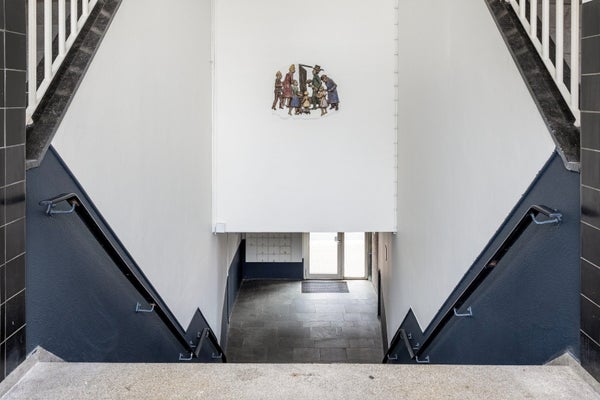 Begane grond: entree gebouw, hal met brievenbussen, trappenhuis.