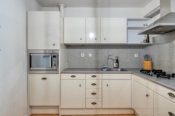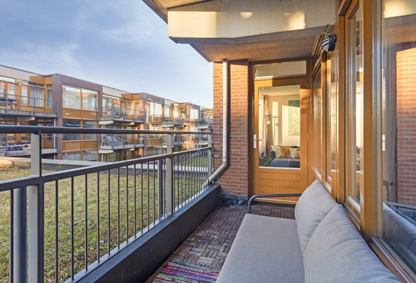 Vanuit de woonkamer stap je het balkon op: een heerlijke plek om even buiten te zitten en te genieten van het groene uitzicht. Een rustige setting waar je echt tot ontspanning komt.