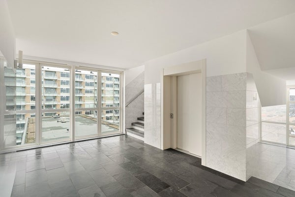 De moderne centrale entree op de begane grond is voorzien van een bellentableau, brievenbussen, trappenhuis en liftinstallatie. Het appartement bevindt zich op de 6e verdieping.