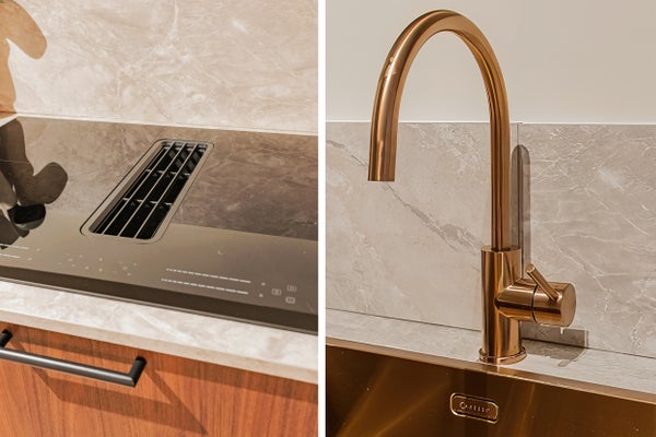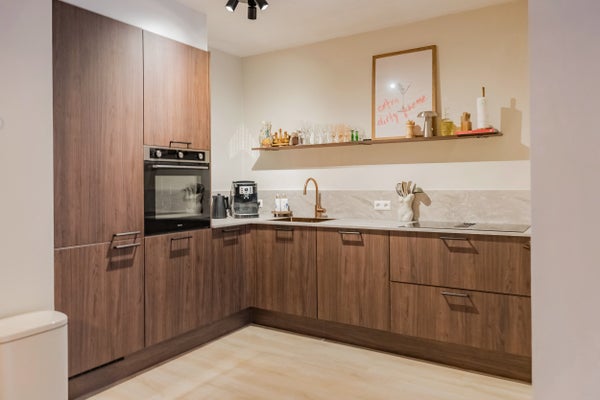 De prachtige open keuken mag echt gezien worden: voorzien van inductiekookplaat met geïntegreerde afzuiging, oven en een stijlvol ontwerp met notenhoutlook kasten, natuursteenlook werkblad en luxe mat rosé-gouden spoelbak en kraan.