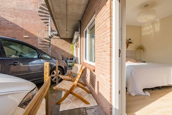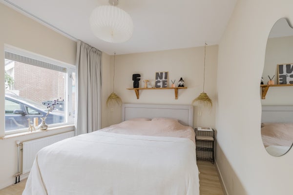 De ruime slaapkamer ligt aan de achterzijde, met een flinke nis voor een grote kledingkast en een deur naar buiten. Hier is plek voor een klein zitje of het stallen van je fiets.