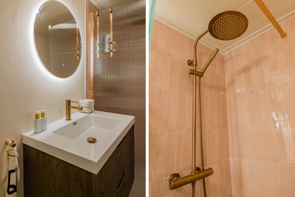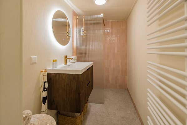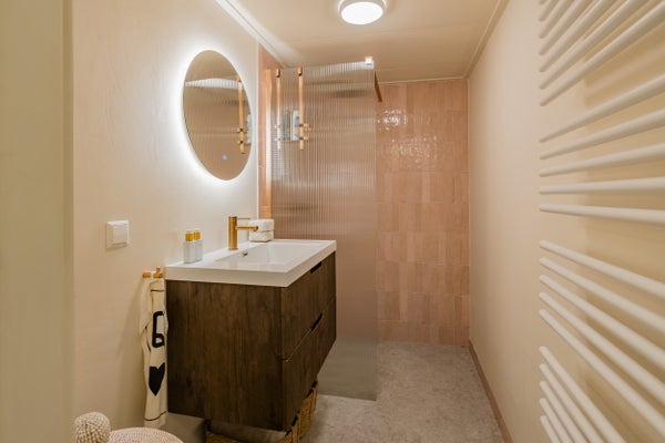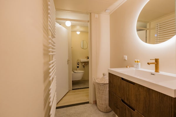 De frisse badkamer heeft een comfortabele inloopdouche en een royaal badkamermeubel, uitgevoerd met dezelfde luxe kranen. Daarnaast is er een separaat toilet.